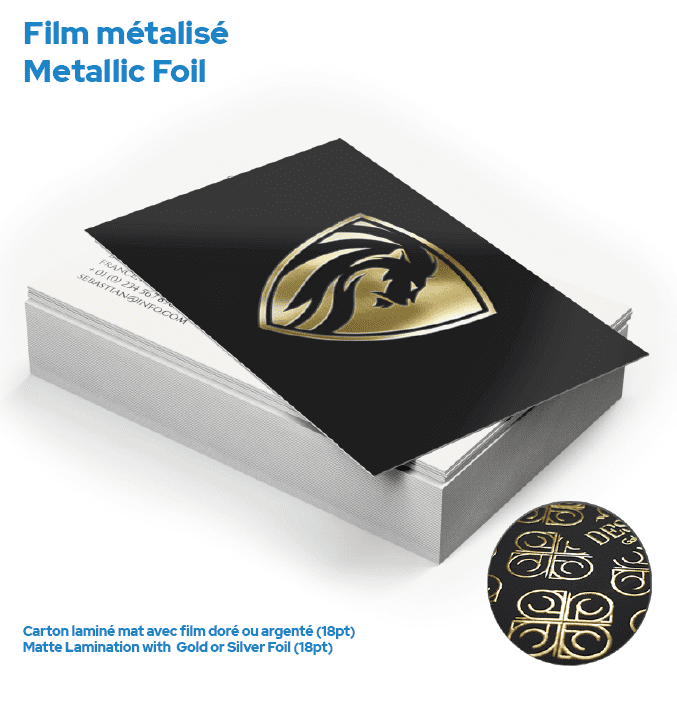 High-end business card made of 16pt stock with matte lamination and 2pt spot gold or silver metallic foil. The raised metallic foil gives this premium card additional texture.