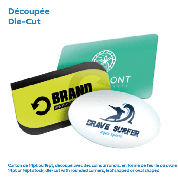 High-end business card made of 14pt or 16pt stock die-cut with rounded corners, in the shape of a leaf or oval-shaped, with a matte or high-gloss varnish.