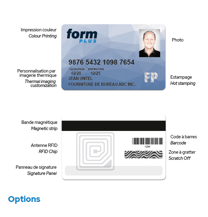 Options available: magnetic stripe, signature panel, scratch area, metallic stamping, RFID chip