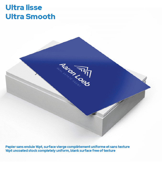 High-end business card made from 16pt uncoated paper with a completely uniform, non-textured blank surface making images more pronounced.