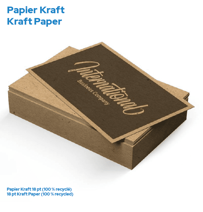 Carte d'affaires haut de gamme en carton GPA Kraft 18pt 100% recyclable et produit à partir d’un processus durable. Elles sont l'option parfaite pour ceux qui aiment imprimer sur du papier de haute qualité mais avec un aspect écologique.