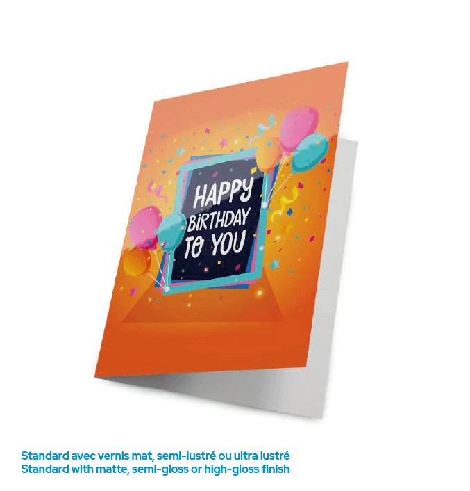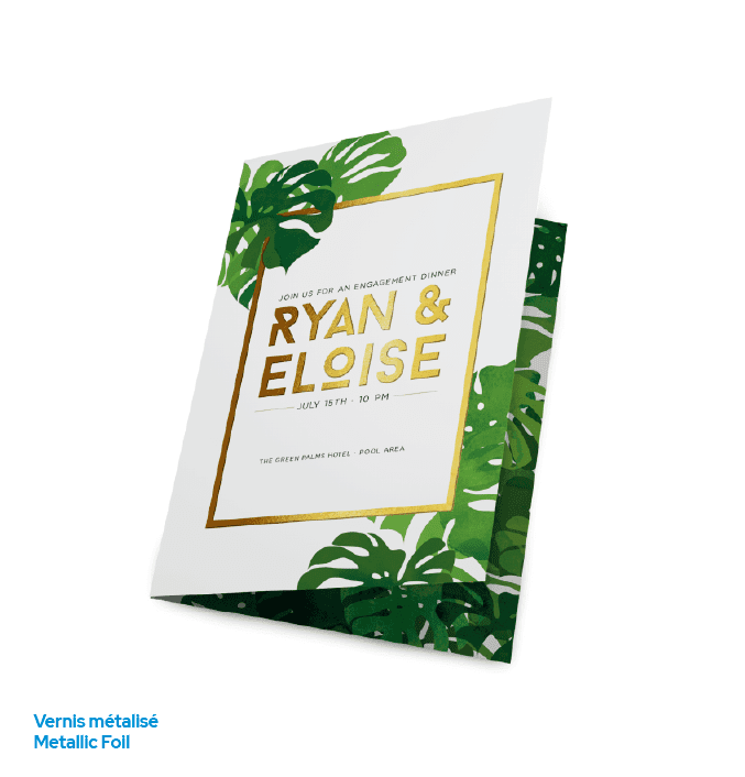 Invitation ou carte annonçant un mariage, une fête, un anniversaire ou un événement corporatif. Formats :    4,25" x 5,5"                   5,5" x 8,5"                   5" x 7"Cartons et finis :  carton 14pt                          avec vernis mat, semi-lustré (sur 1 ou 2 côtés) ou ultra lustré                          avec film métallisé                            (lamination mate et film métallisé localisé argent ou or, sur 1 ou 2 côtés)                         Kraft                            (18pt Kraft 100% recyclé)                         Perlé                            (Pearlescents 110lb)                       Enveloppes : vendue avec ou sans enveloppes (blanches et non-imprimées)Temps de production : habituellement de 7 à 10 jours ouvrablesNOTE :   Le vernis pourrait rendre l'écriture difficile.Utiliser le formulaire ci-dessous pour nous envoyer une demande de soumission détaillée.