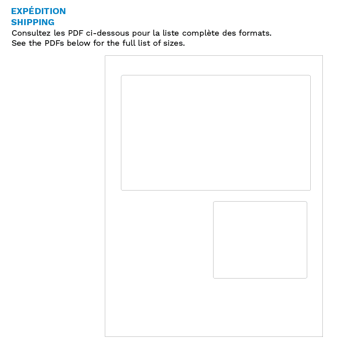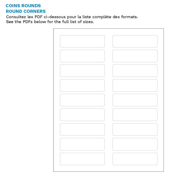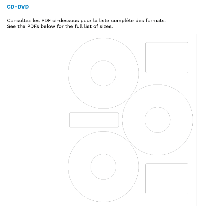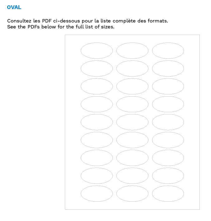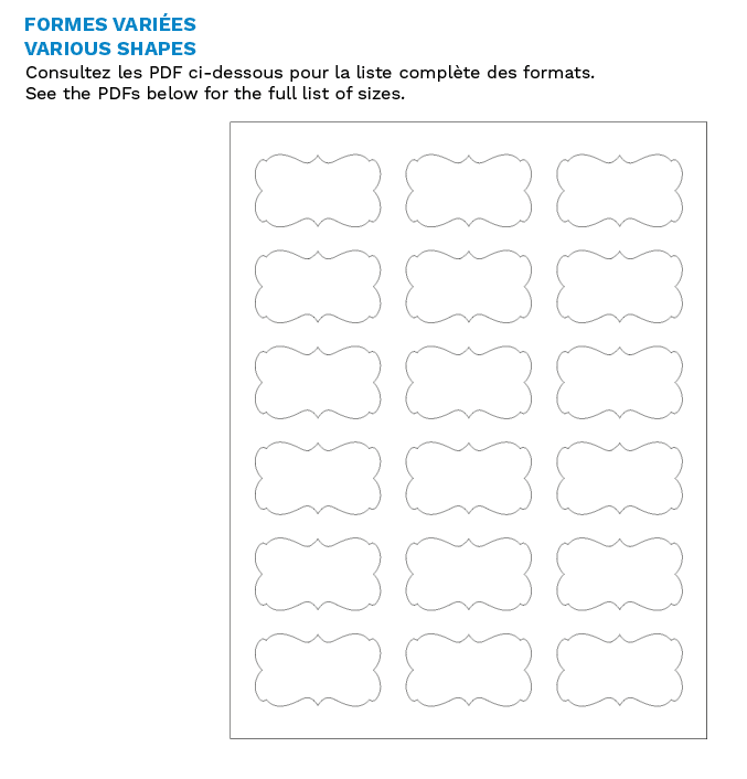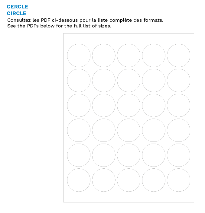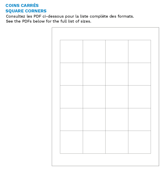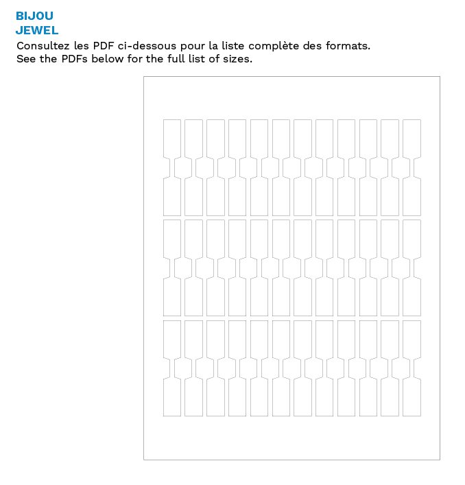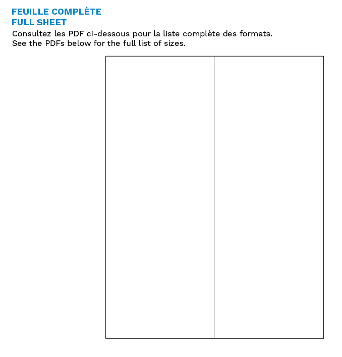 Consultez les PDF ci-dessous pour la liste complète des formats ainsi que les papier et types adhésifs disponibles.